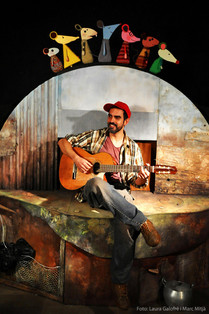 Un temporer rodamón acompanyat de la seva guitarra arriba a una cruïlla de camins.